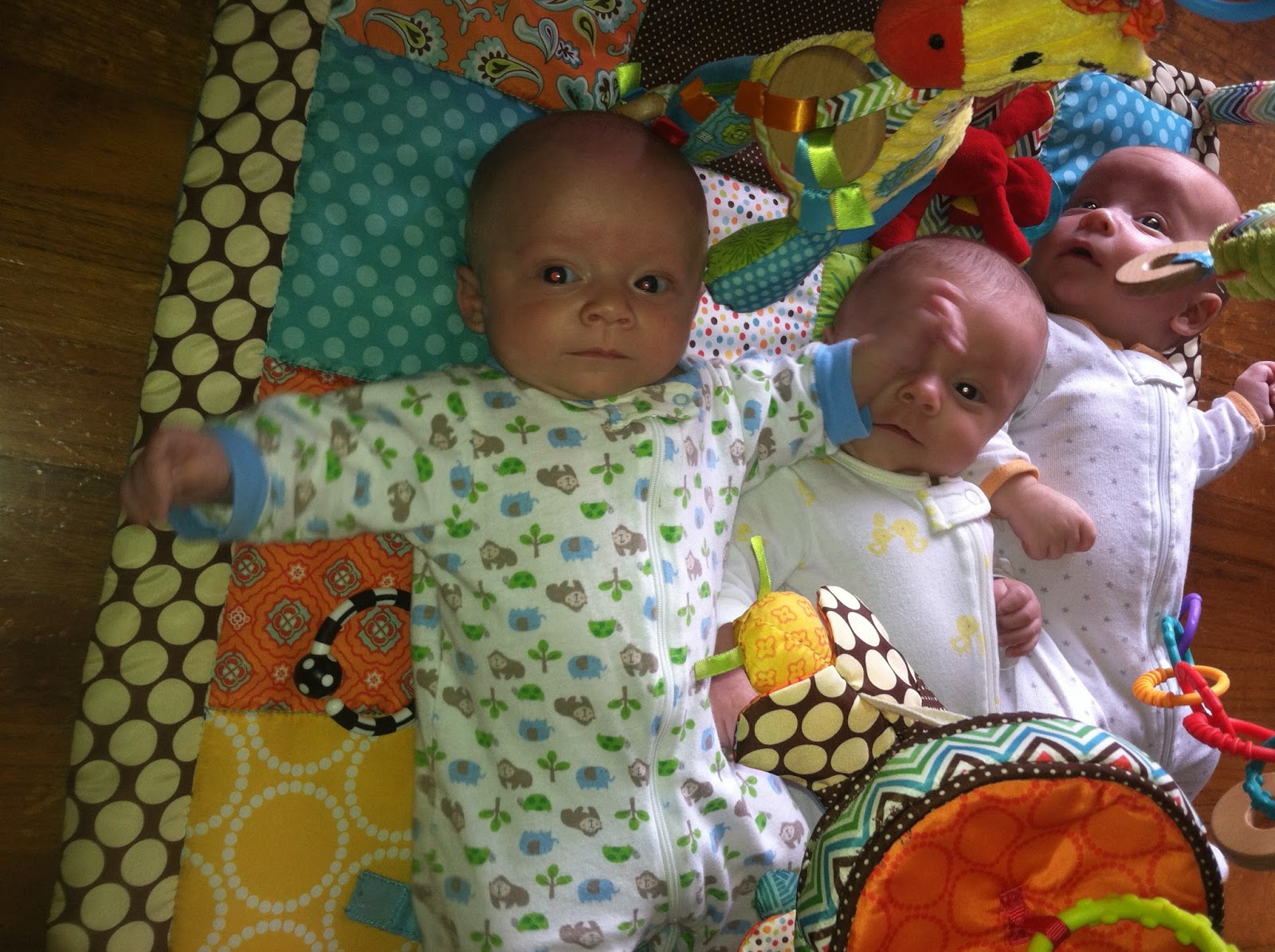 They love people and will follow you with your eyes if you are talking or walking through the room. They also love watching Wrigley run through the room as long as he trying to jump on them while they are eating or barking like a manic - he is starting to disturb their sleep :-(. They all smile and coo and are moments away from laughing (I can feel it). They love their activity mats (Archer especially), mirrors, and cuddling. They love being swaddled, but don't care much for the act of getting swaddled. They also love bath time now (and are getting chubby legs).